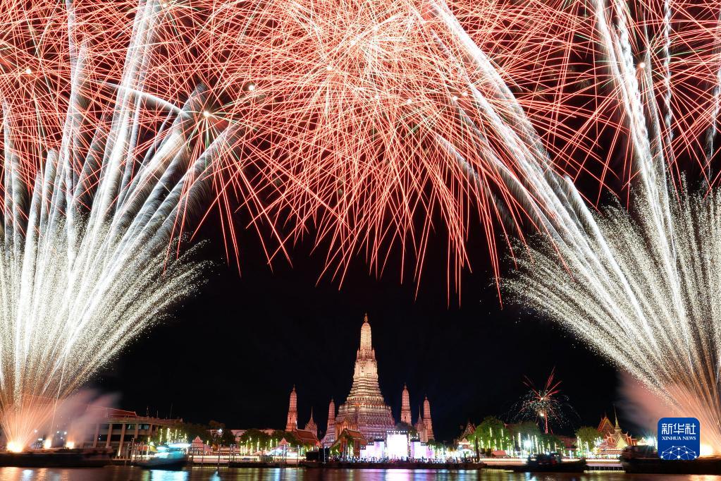 這是2023年1月1日在泰國曼谷鄭王廟上空拍攝的新年煙花。
