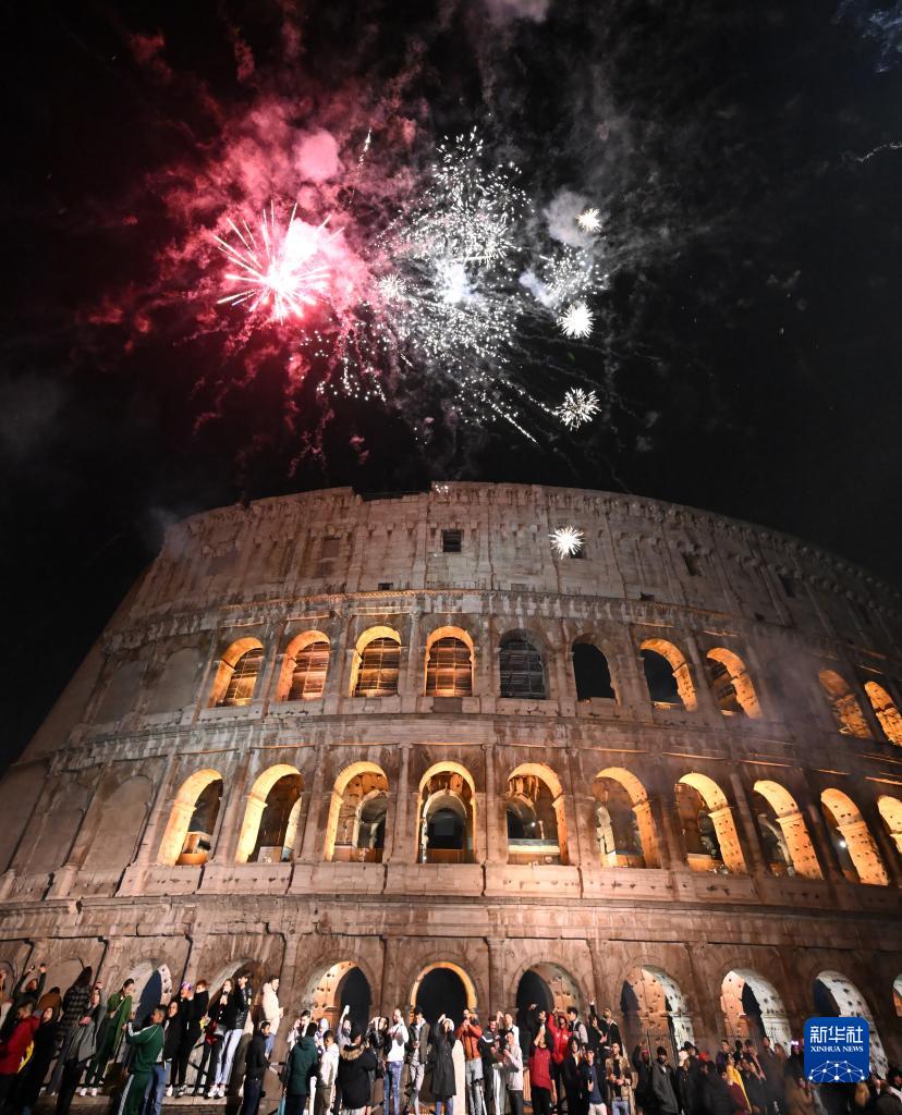 這是2023年1月1日在意大利羅馬斗獸場附近拍攝的新年煙花。
