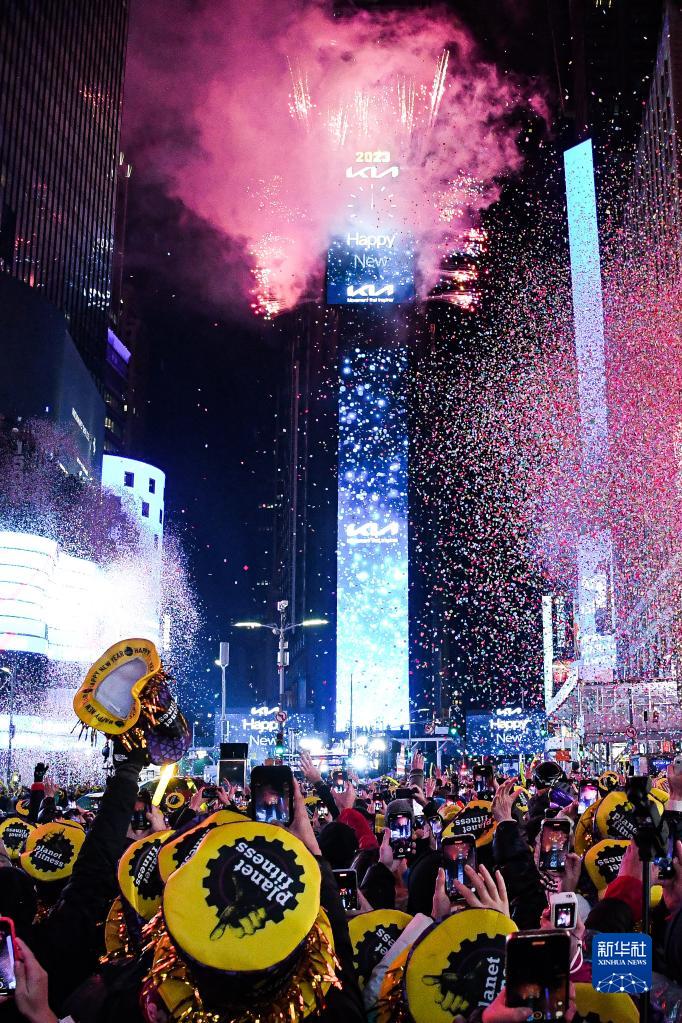 2023年1月1日,人們在美國紐約時報廣場參加跨年活動。