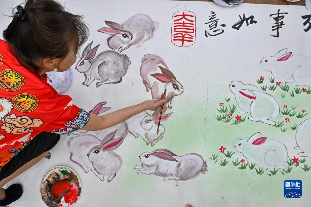 2023年1月1日,在馬來西亞雪蘭莪州的仁嘉隆,一名書畫愛好者參與創作以“兔陣涌春”為主題的水墨畫長卷,迎接2023新年和即將到來的農歷兔年。