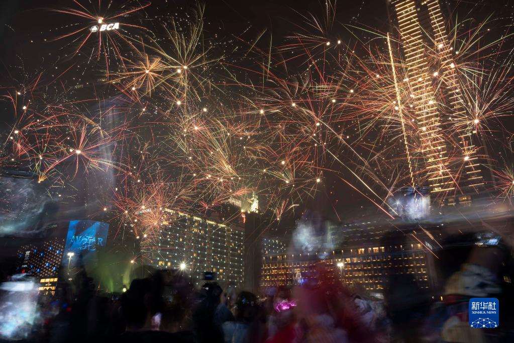 2023年1月1日,人們在印度尼西亞雅加達觀看新年煙花。