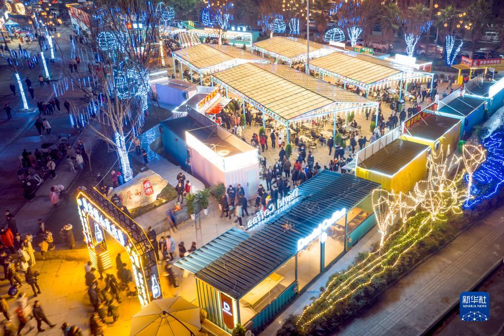 2022年12月31日晚,四川省華鎣市“華鎣山夜市”吸引市民前來購物、品嘗美食(無人機照片)。