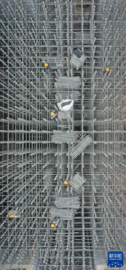 1月1日,浙江省臺州市杭溫鐵路仙居高架站項目現場,工人在加緊施工(無人機照片)。