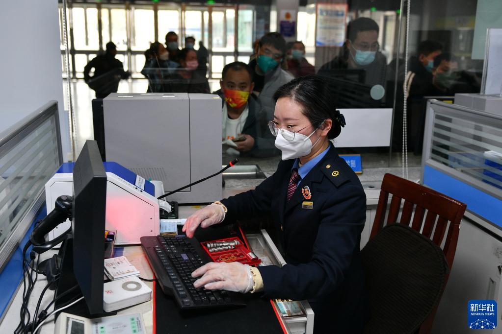1月1日,江蘇常州火車站鐵路工作人員在售票處為乘客出售火車票。
