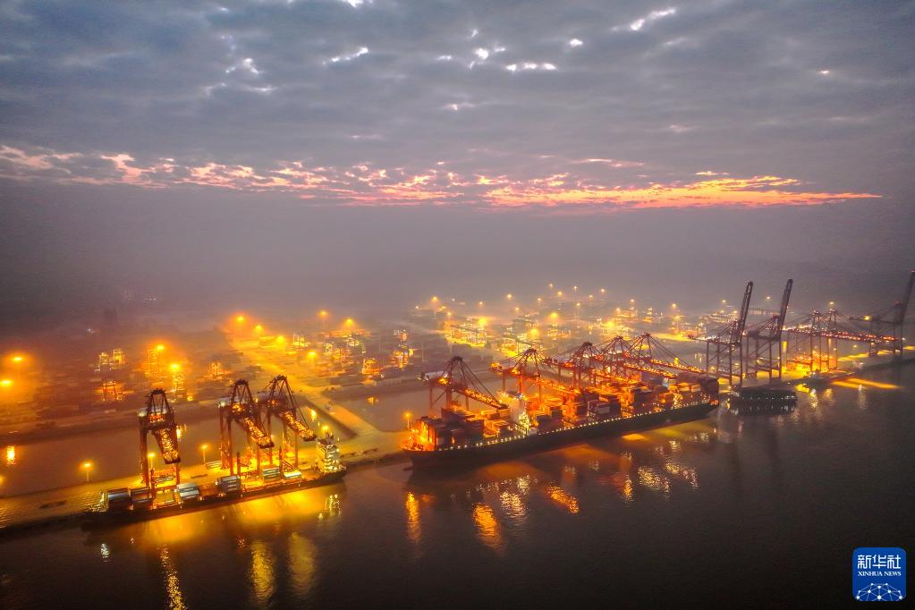 1月1日,集裝箱輪在寧波舟山港金塘港區大浦口集裝箱碼頭進行裝卸作業(無人機照片)。