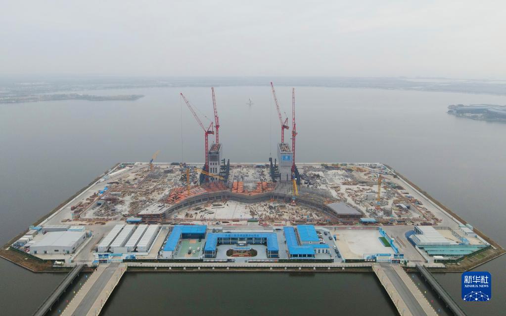 1月1日,工人在位于中國(上海)自由貿易試驗區臨港新片區的中建二局臨港西島中銀金融中心項目工地上忙碌(無人機照片)。