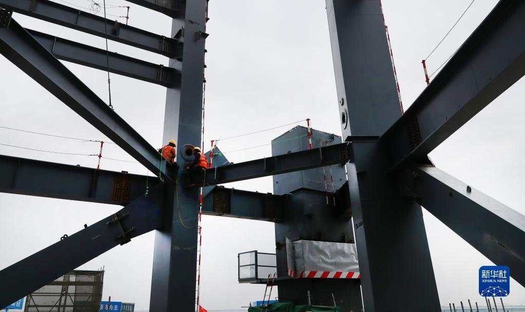 1月1日,在位于中國(上海)自由貿易試驗區臨港新片區的中建二局臨港西島中銀金融中心項目工地,工人在進行鋼結構螺栓緊固工作。