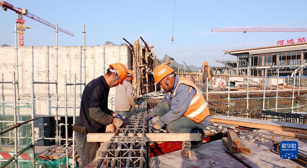 1月1日,工人在貴南高鐵廣西河池站前廣場工地捆扎鋼筋。