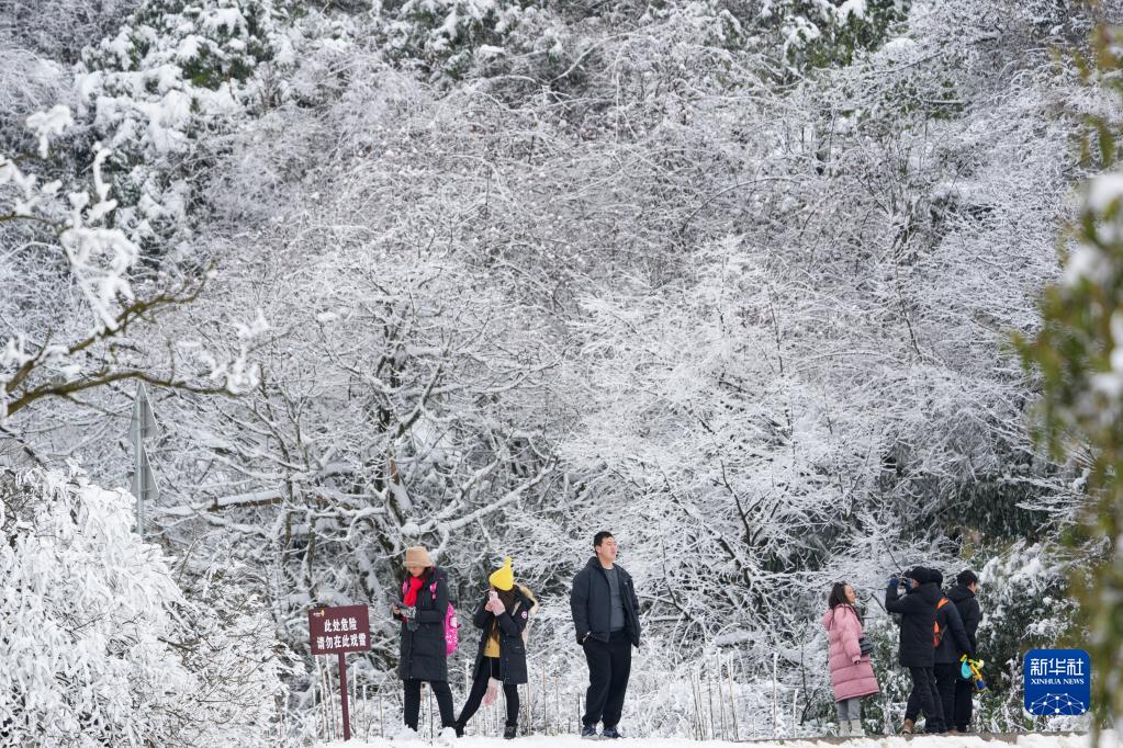當日,位于重慶市南川區的世界自然遺產地金佛山迎來降雪。景區內雪花紛飛,銀裝素裹,南方罕有的冰雪景色吸引了眾多游客前往觀光旅游。據了解,當日金佛山景區接待游客達12000人,實現了新年冬季旅游的“開門紅”。