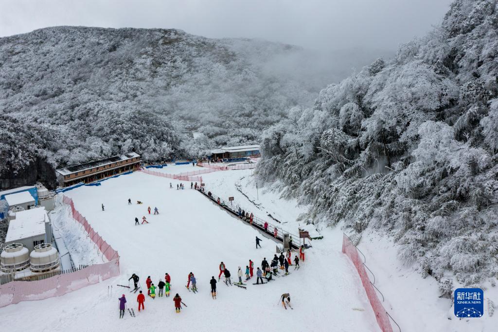 1月1日,游客在金佛山景區的滑雪場體驗滑雪(無人機照片)。