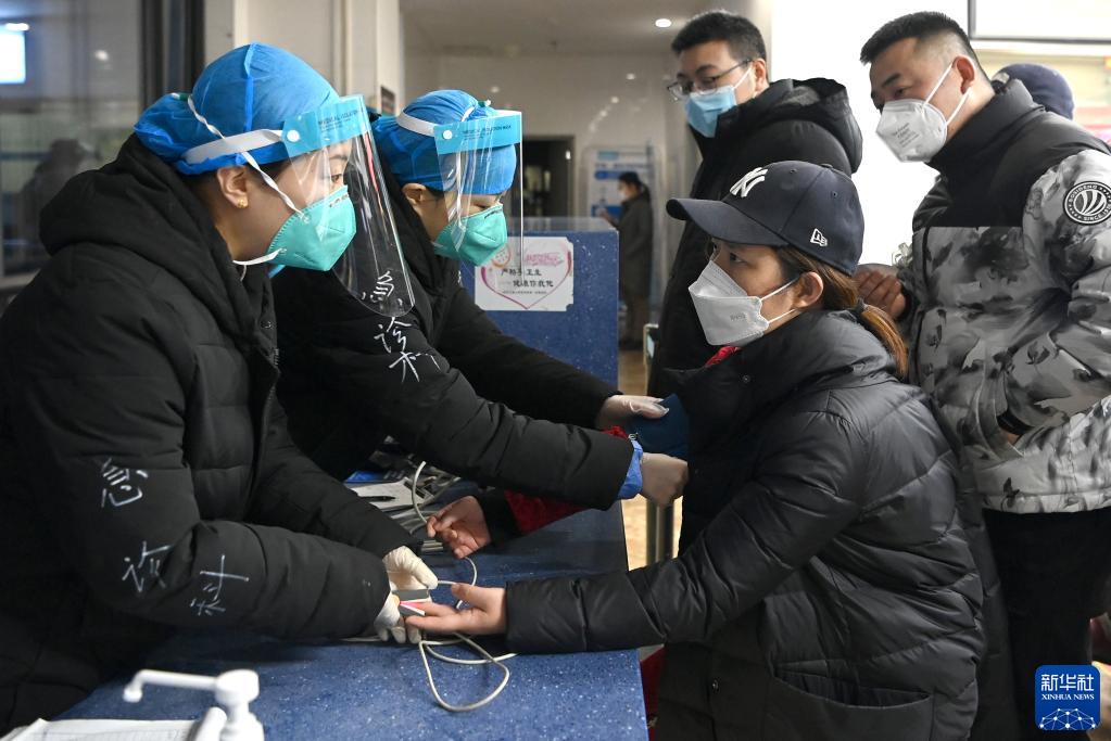 2022年12月31日,西安交通大學第一附屬醫院急診科分診臺的醫務人員為患者測量脈搏血氧飽和度。