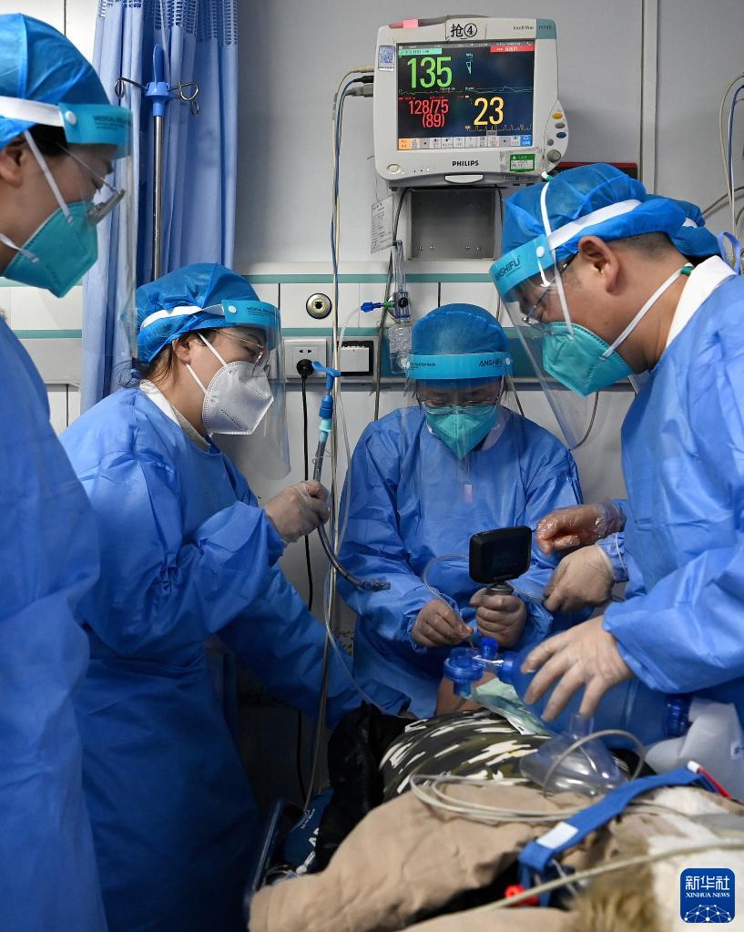 2022年12月31日晚,西安交通大學第一附屬醫院急診科的醫務人員為病人進行氣管插管。