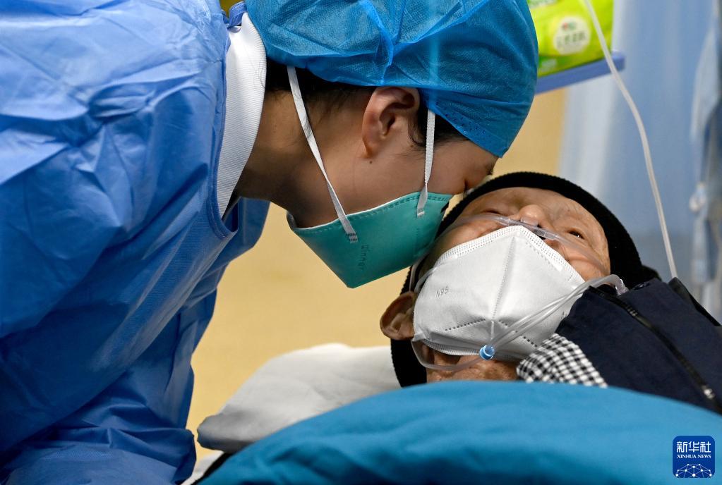2022年12月31日,西安交通大學第一附屬醫院急診科的醫務人員靠近一名聽力不好的患者進行問詢。