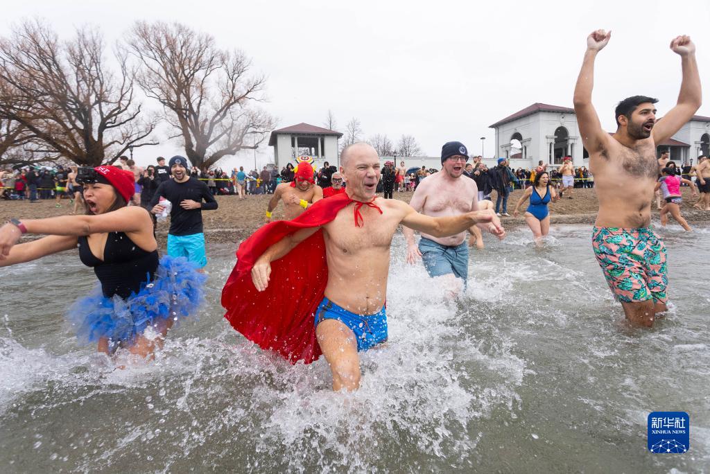 1月1日,在加拿大多倫多,冬泳活動參與者沖入安大略湖中。