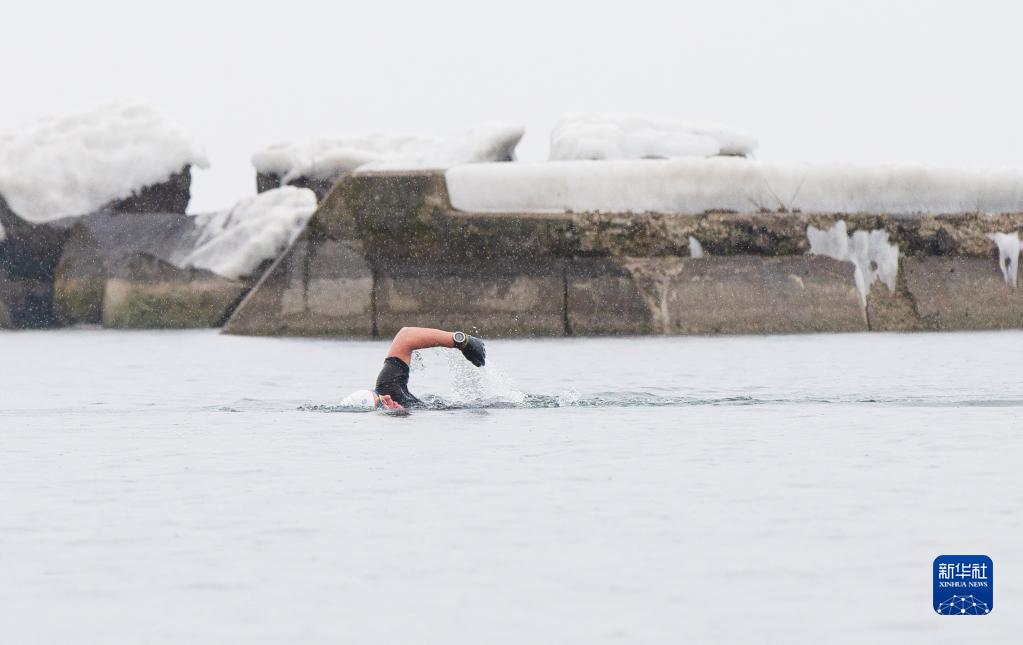 1月1日,在加拿大多倫多,一名冬泳活動參與者在安大略湖中游泳。