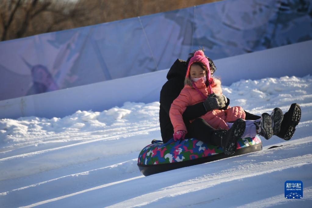 1月2日,一名小朋友和家長在北京玉淵潭公園體驗“雪上飛碟”。