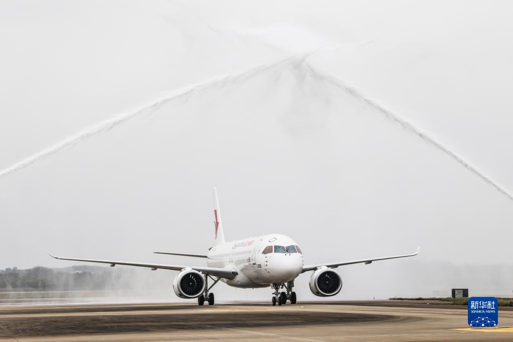 1月2日,??诿捞m國際機場為國產大飛機C919舉行“過水門”儀式。