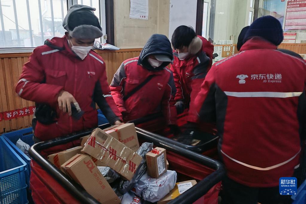 1月1日,在京東物流東北分公司長春朝陽營業部,快遞員分揀快遞。