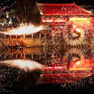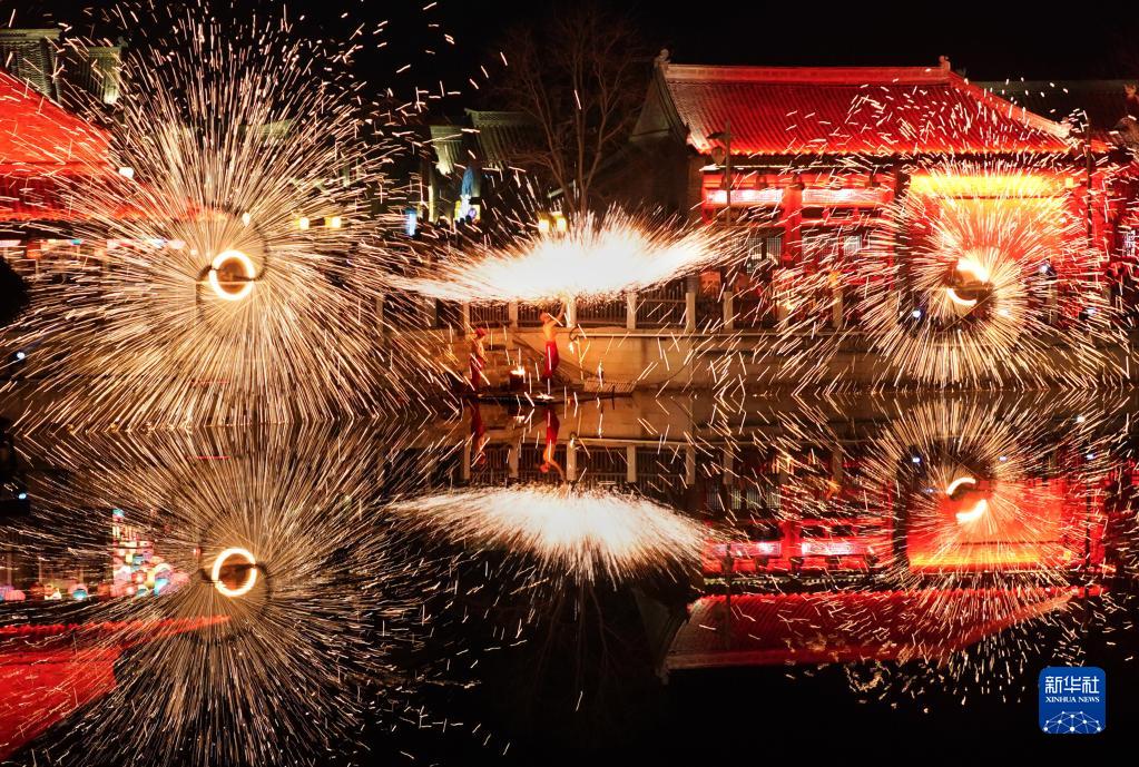 2022年12月31日,工作人員在位于鄭州市中牟縣的電影小鎮里表演打鐵花。