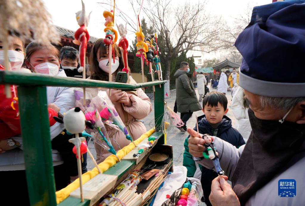 2023年1月2日,游客在開封市清明上河園里挑選民間藝人制作的面人。