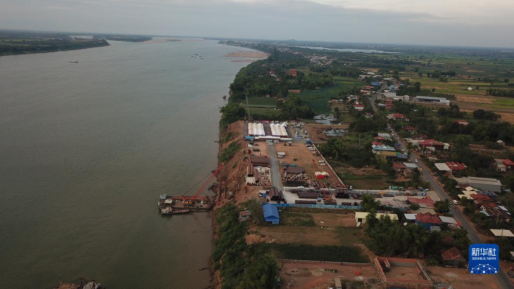 這是1月1日在柬埔寨桔井市拍攝的中企承建大橋工地(無人機照片)。