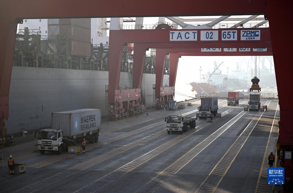 1月1日,卡車在天津港聯盟國際集裝箱碼頭運輸集裝箱。