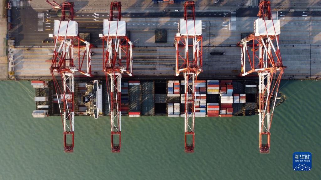 1月1日,一艘貨輪靠泊在天津港聯盟國際集裝箱碼頭進行裝卸作業(無人機照片)。