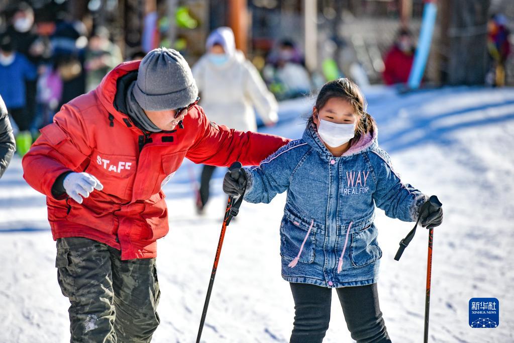 1月2日,在天津市薊州區一主題樂園,小朋友在教練的陪同下體驗初級滑雪。
