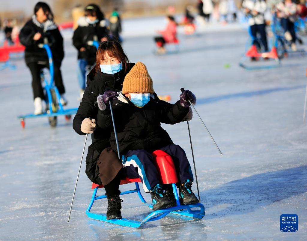 1月1日,市民在甘肅張掖國家濕地公園滑冰場坐滑冰車。