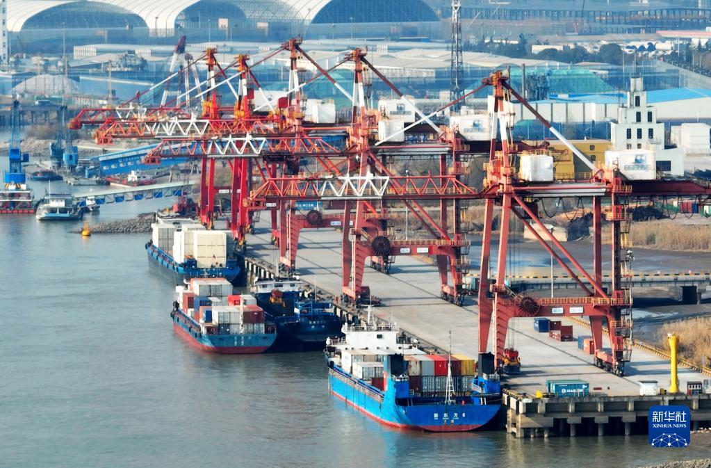 1月3日,在江蘇省揚州港集裝箱碼頭,貨輪停在泊位上裝卸集裝箱(無人機照片)。