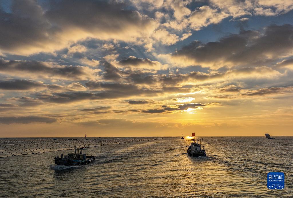 1月3日,漁民駕駛漁船前往海洋牧場養殖區開展生產作業(無人機照片)。