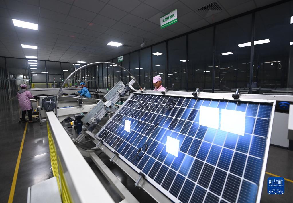1月3日,工人在浙江格普光能科技有限公司的車間內檢驗光伏組件成品。