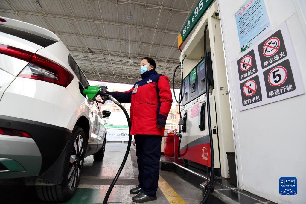 1月3日,河北省邯鄲市叢臺區一家加油站的工作人員給車輛加油。