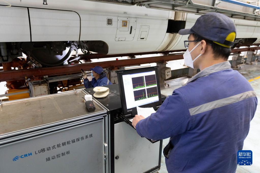 1月3日,在上海虹橋動車運用所,探傷工(右)對動車組輪輞輪輻進行探傷作業。