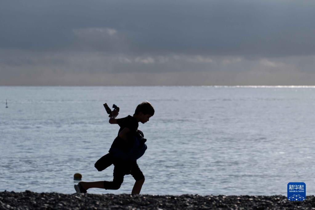 1月3日,一名兒童在法國南部城市尼斯的海邊休閑。