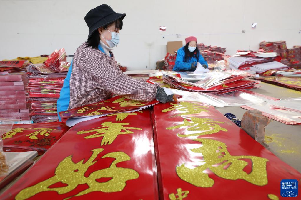 春節臨近,河南省焦作市溫縣岳村街道呂村印刷的春聯俏銷,村民們加緊趕制、銷售大紅春聯和年畫,一派紅紅火火的繁忙景象。