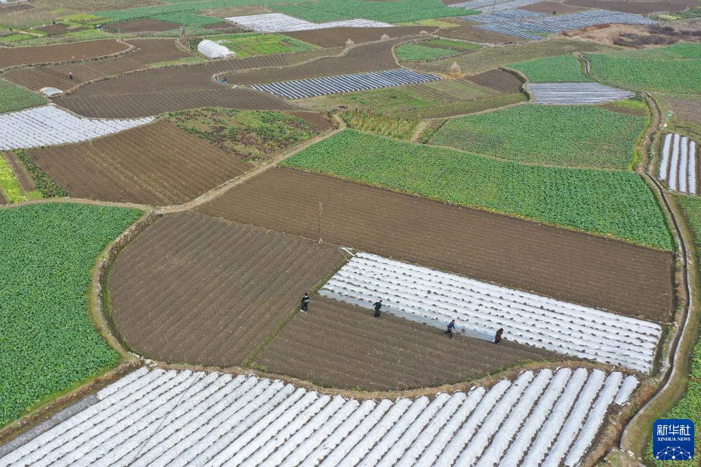 1月3日,在湖南省湘西土家族苗族自治州吉首市乾州街道西門口村,村民在田間給種植的馬鈴薯覆蓋地膜(無人機照片)。