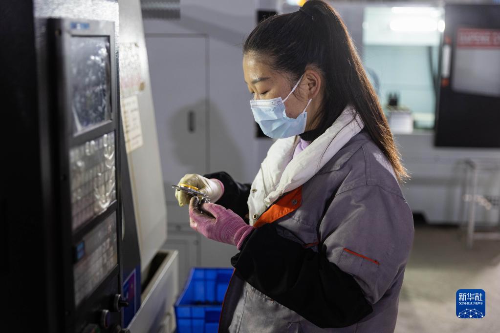 1月4日,在四川省會東縣小岔河特色產業園區一家汽車零部件企業的生產車間,工人汪春芝在工作中。她原是會東縣魯吉鎮坡腳村村民,現在安置在小岔河水電庫區移民居民點。