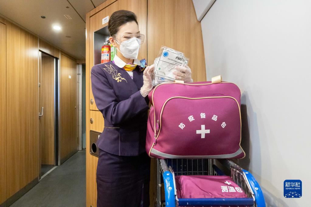 1月4日,鐵路上??瓦\段乘務員在列車上整理防疫備品包。