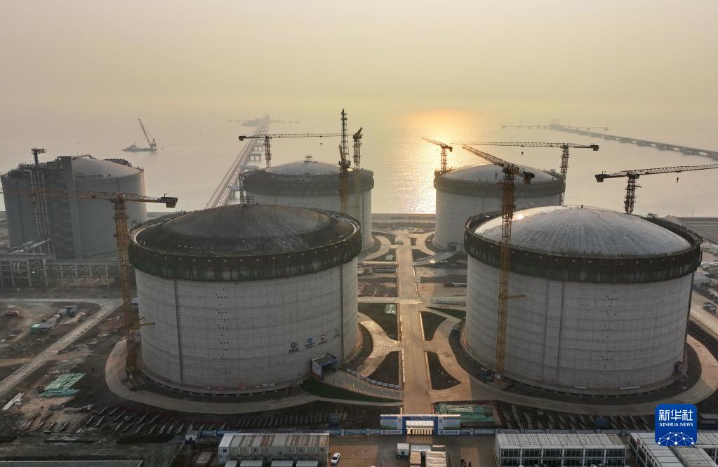 1月4日拍攝的唐山市曹妃甸區新天LNG(液化天然氣)項目接收站工程建設工地(無人機照片)。