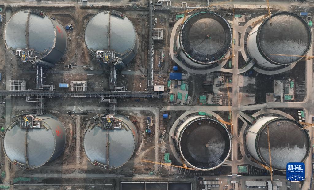 1月4日拍攝的唐山市曹妃甸區新天LNG(液化天然氣)項目接收站工程建設工地(無人機照片)。