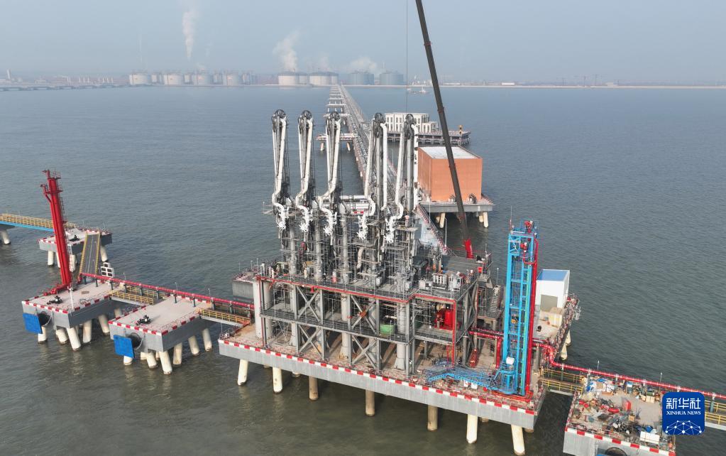 1月4日,工人在唐山市曹妃甸區新天LNG(液化天然氣)項目接收站碼頭施工(無人機照片)。