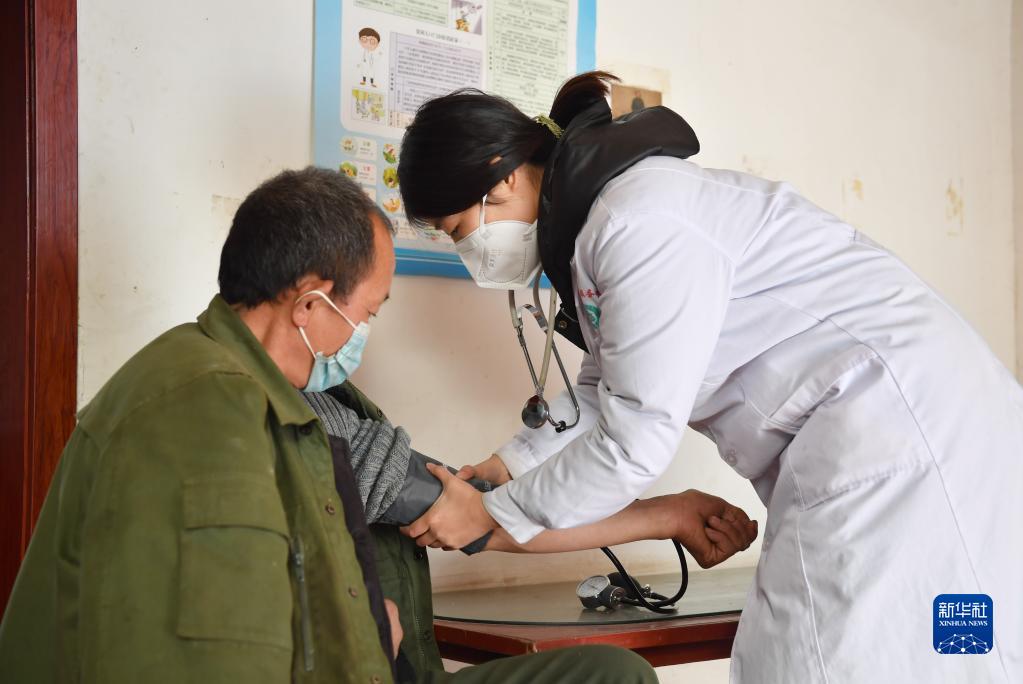 1月3日,上門問診的醫生崔思語在西安市長安區灤鎮街道灃峪村村民段春成家中為其測量血壓。