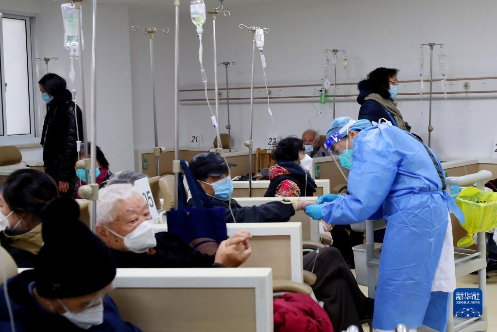 1月4日,醫務人員在上海市斜土街道社區衛生服務中心輸液室內為病人輸液。