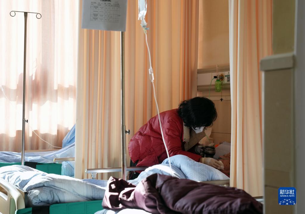 1月4日,在上海市松江區九亭鎮社區衛生服務中心病房,一位女士在照顧90歲的母親。