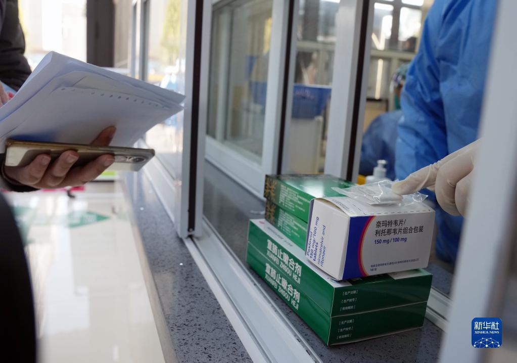 1月4日,在上海市松江區九亭鎮社區衛生服務中心發熱門診,藥房人員在窗口向患者家屬發藥。