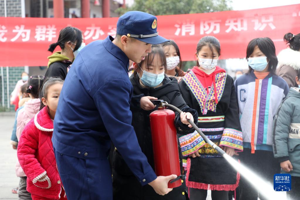 1月4日,在資興市唐洞街道茶坪瑤族村,小朋友在消防員的指導下學習滅火技能。