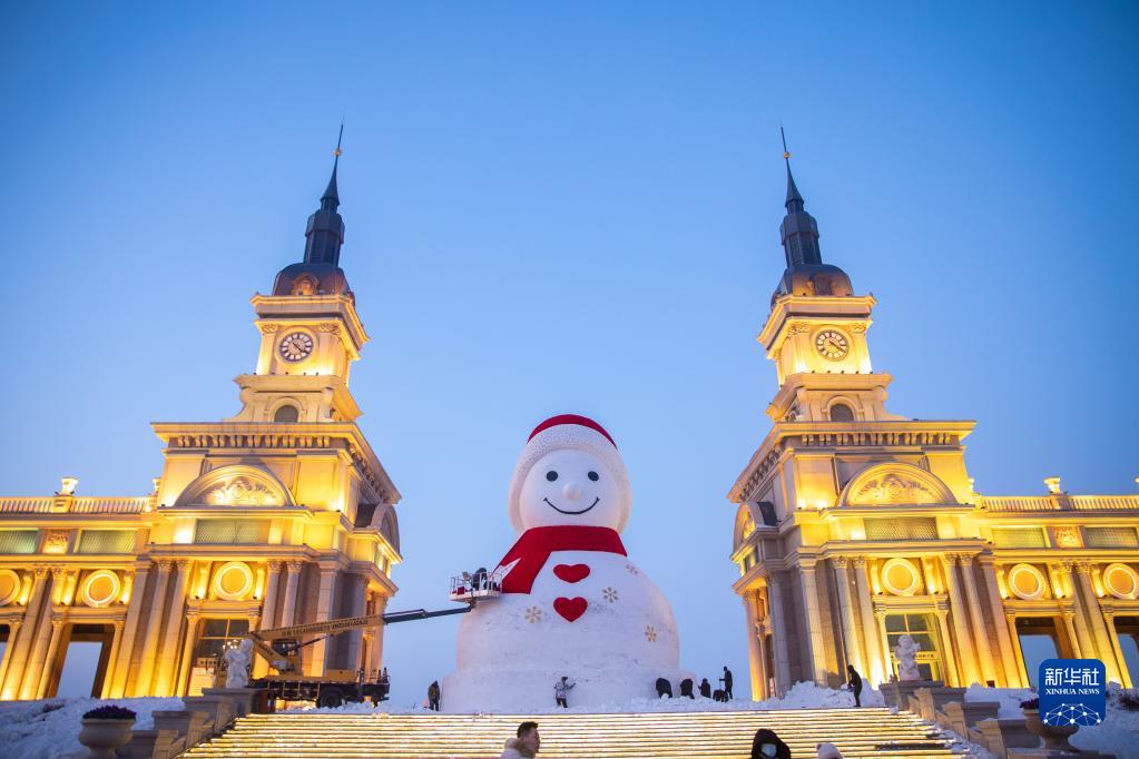 1月4日,經過工人十余天的忙碌,憑借“超治愈”的笑容,成為哈爾濱“網紅”的大雪人,“回歸”松花江畔。今年的大雪人用雪量約2000立方米,依舊18米高,憨態可掬。
