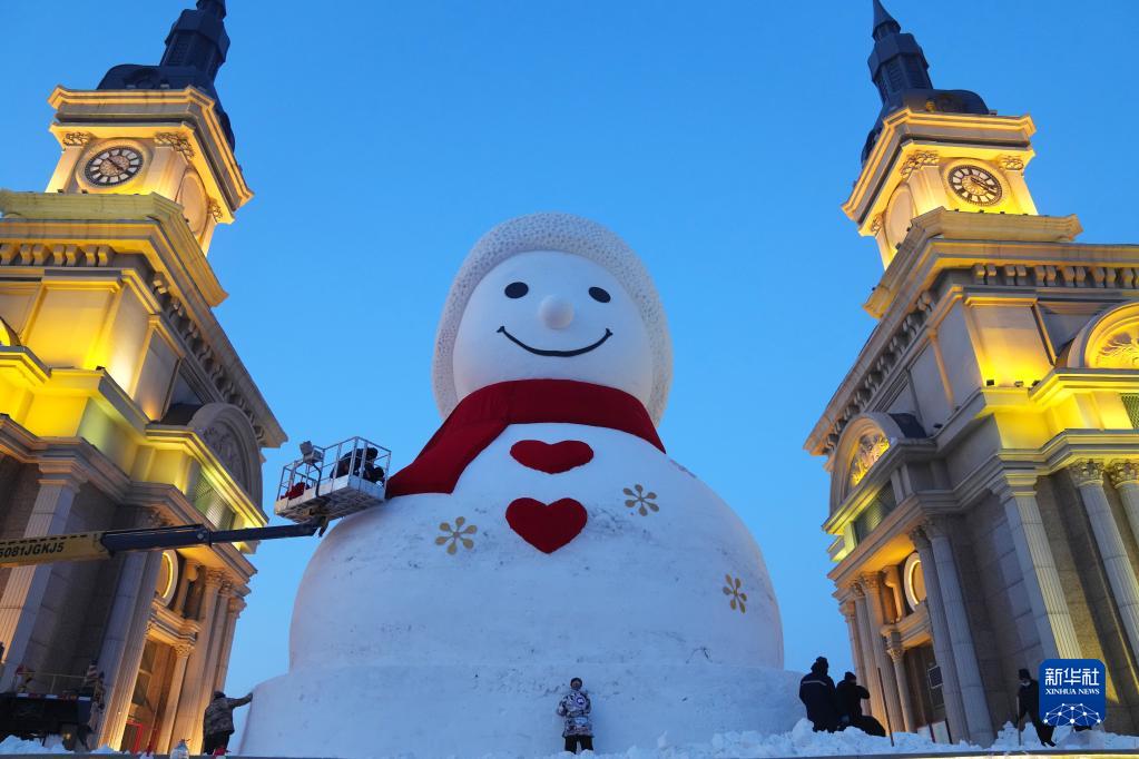 1月4日,經過工人十余天的忙碌,憑借“超治愈”的笑容,成為哈爾濱“網紅”的大雪人,“回歸”松花江畔。今年的大雪人用雪量約2000立方米,依舊18米高,憨態可掬。