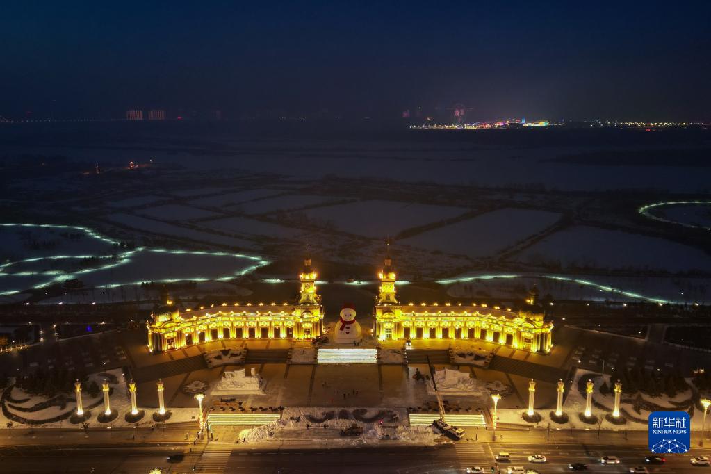 1月4日,在哈爾濱松花江畔,工人進行大雪人收尾工作(無人機照片)。